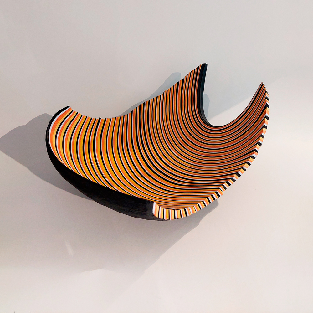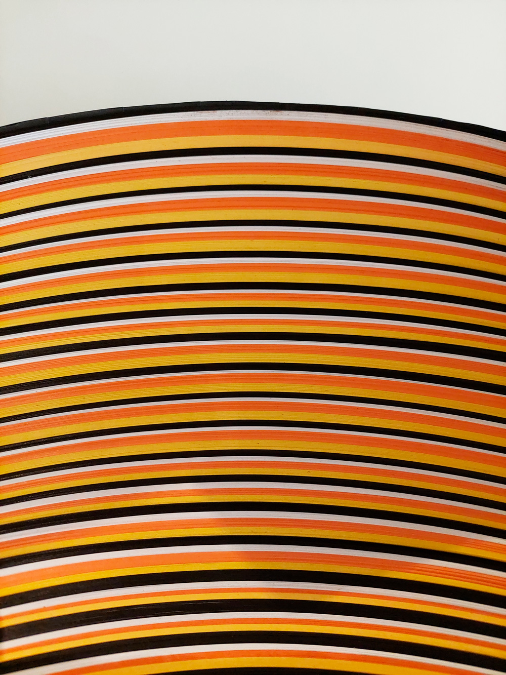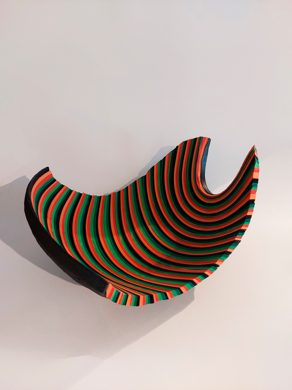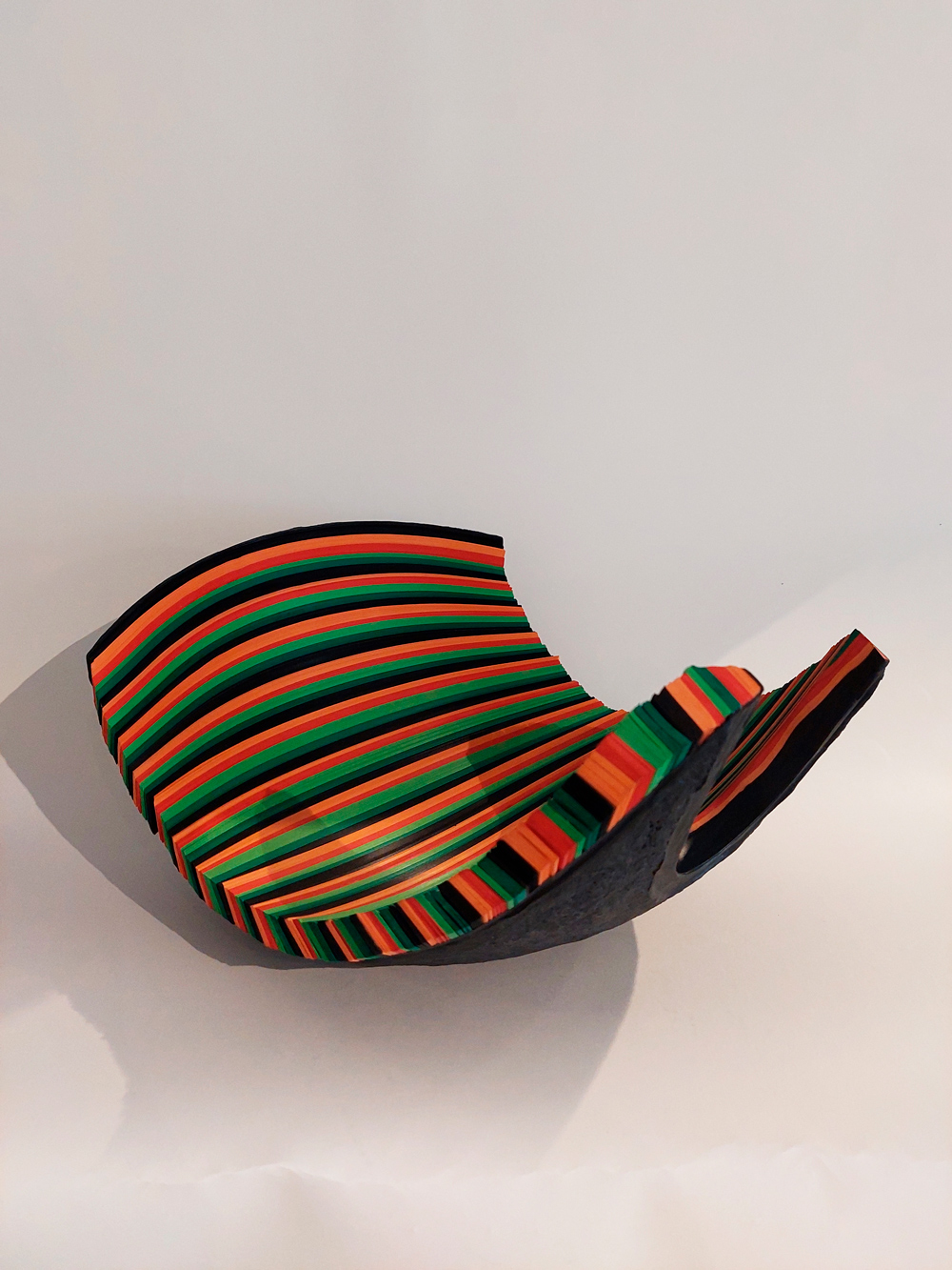 Ciotola realizzata con volumi concavi ad intarsio concentrico di strisce di cartoncino colorate e dipinte con aniline. Esterno in pasta di cellulosa e terre colorate.