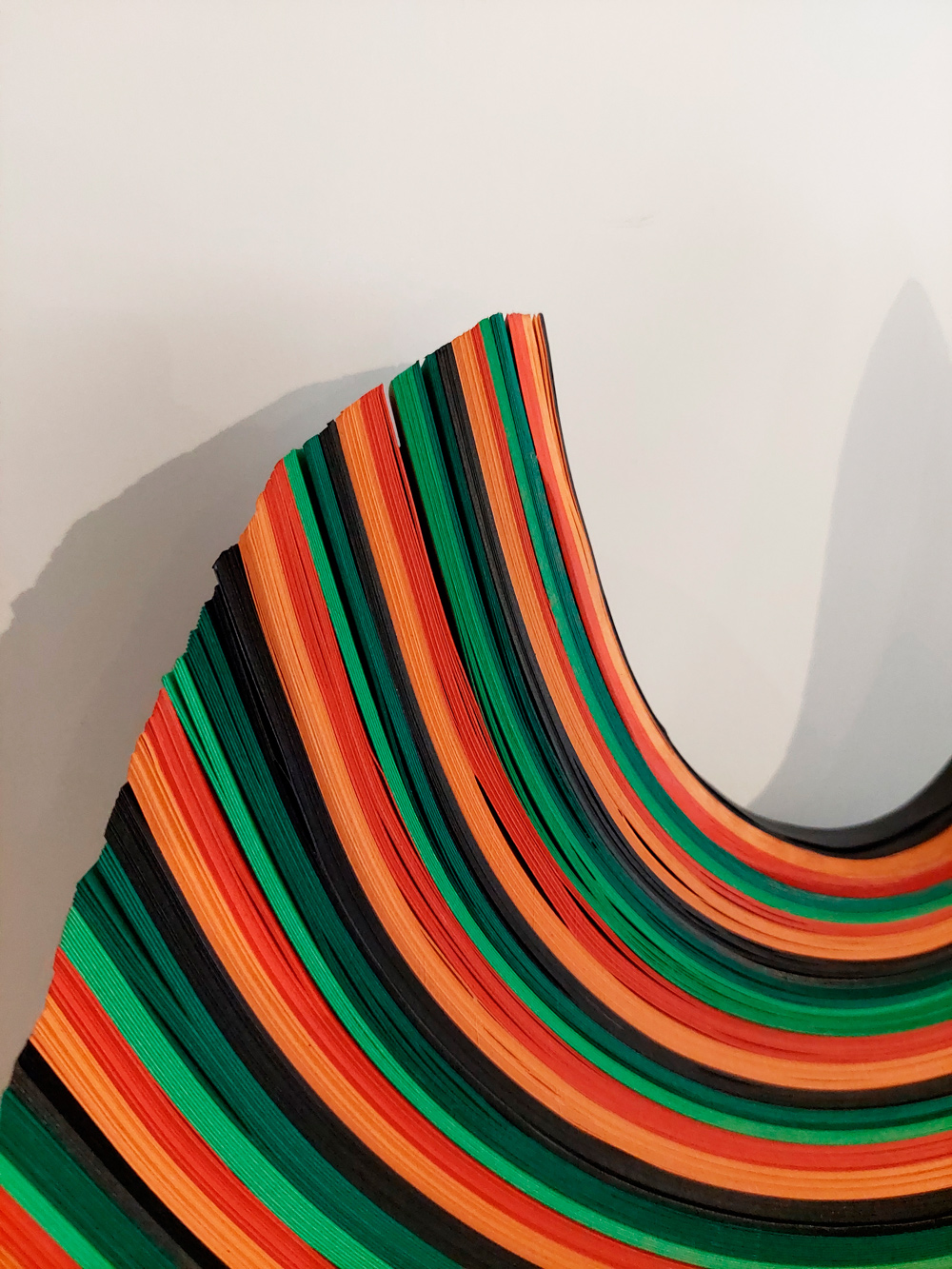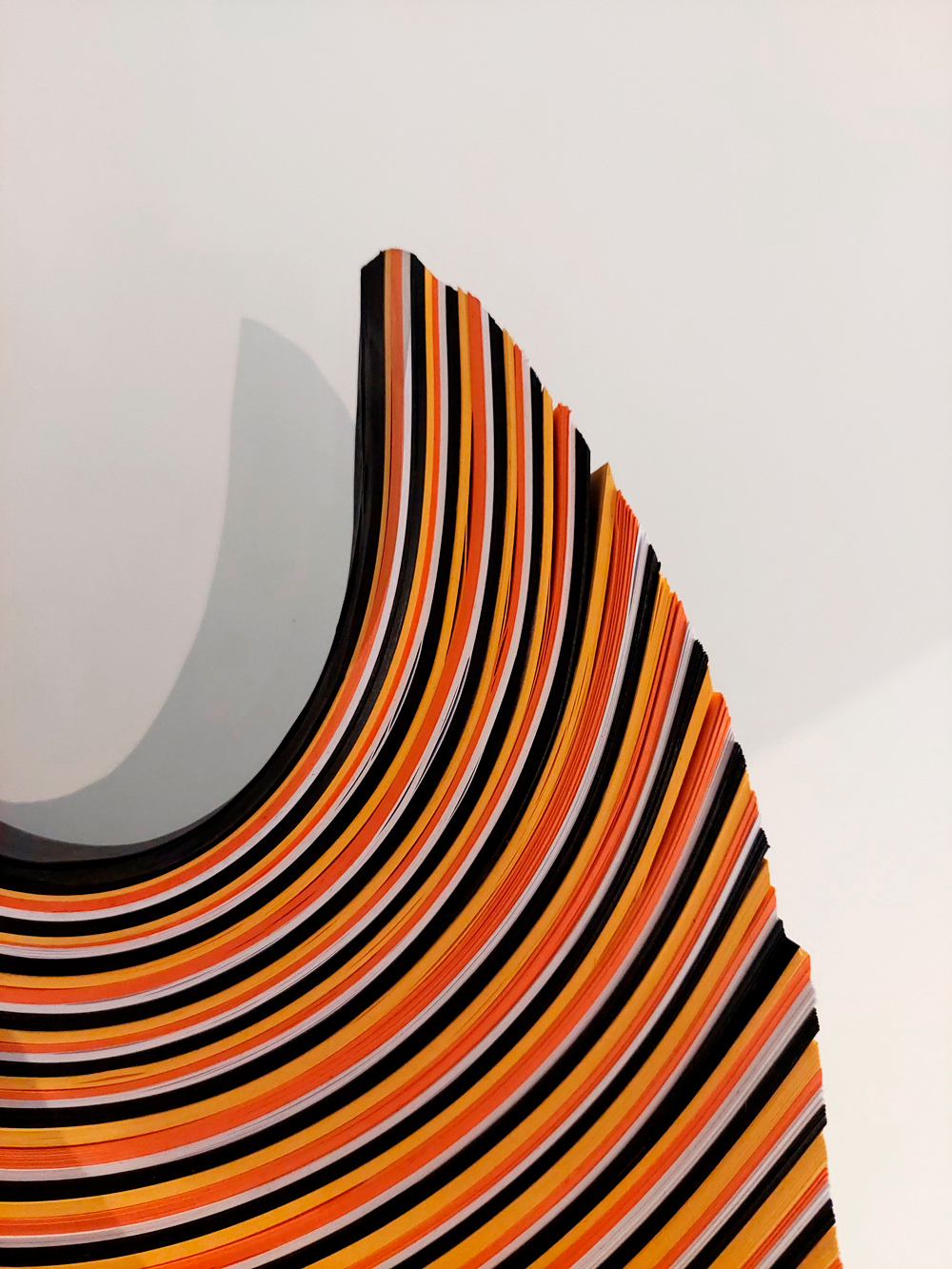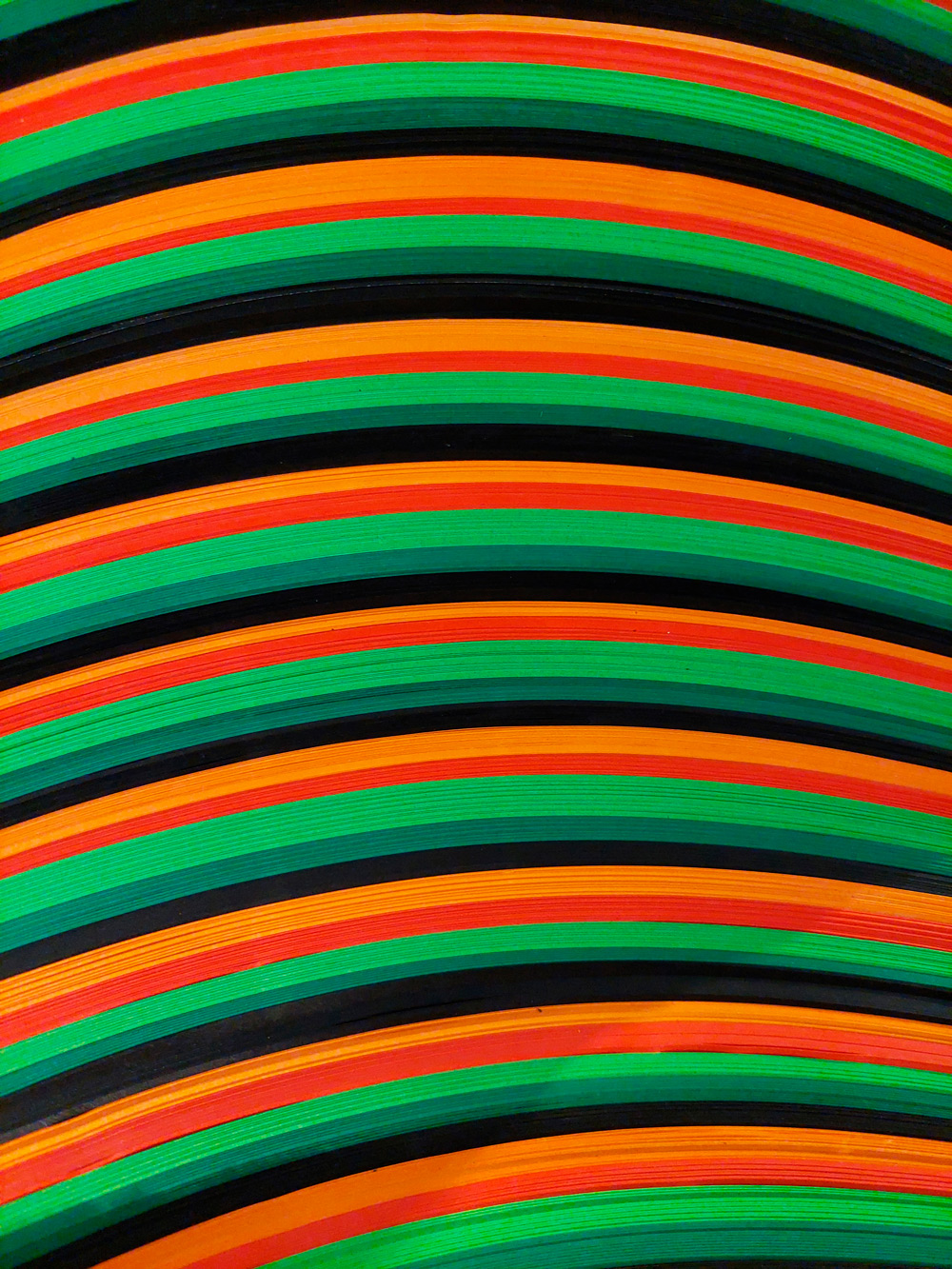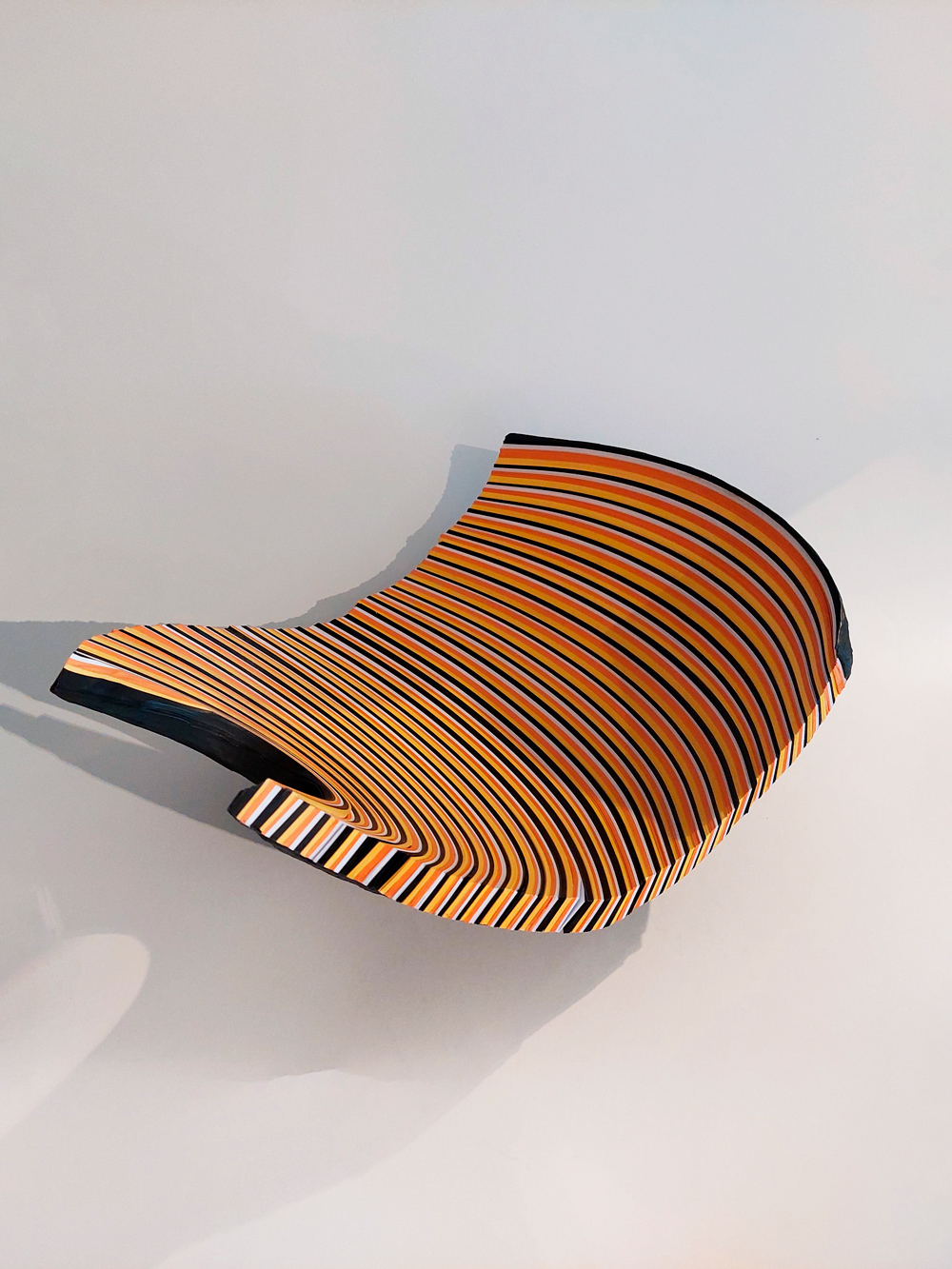 Ciotola realizzata con volumi concavi ad intarsio concentrico di strisce di cartoncino colorate e dipinte con aniline. Esterno in pasta di cellulosa e terre colorate.