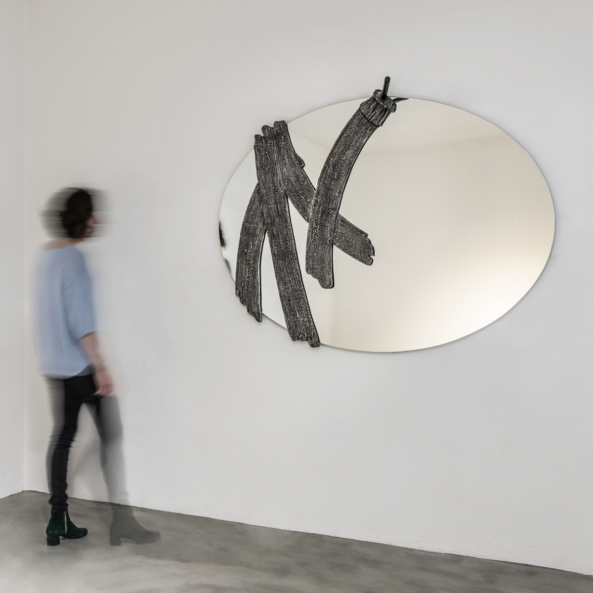 Specchio con struttura in fusione a terra di alluminio patinato. Riproduce con precisione l’attimo interrotto, la sospensione spazio-temporale che si crea quando si compie un gesto, anche semplice come una pennellata.