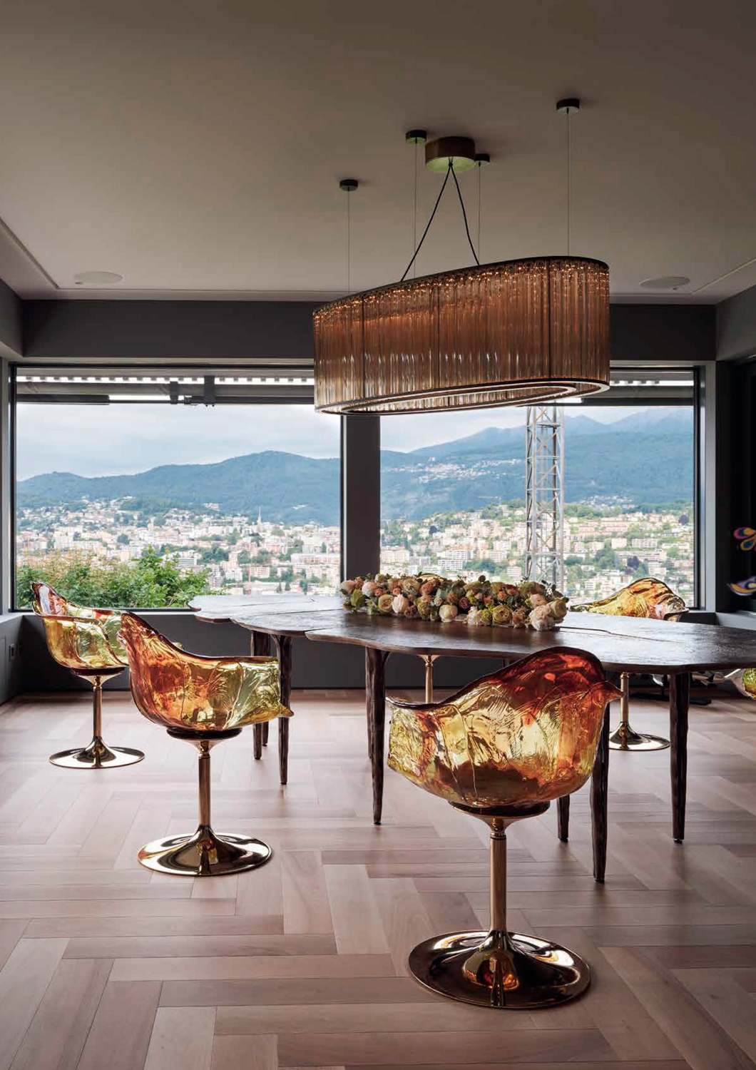 In questo tavolo da pranzo il piano è composto da elementi uniti tra loro e realizzati in fusione di alluminio. Le superfici sinuose sembrano animate da un movimento segreto, una vibrazione interiore che restituisce l’impressione di una forma in continua evoluzione. Le gambe, ottenute anch'esse dalla fusione e modellate a mano, si ergono come monoliti silenziosi, innalzando il piano.