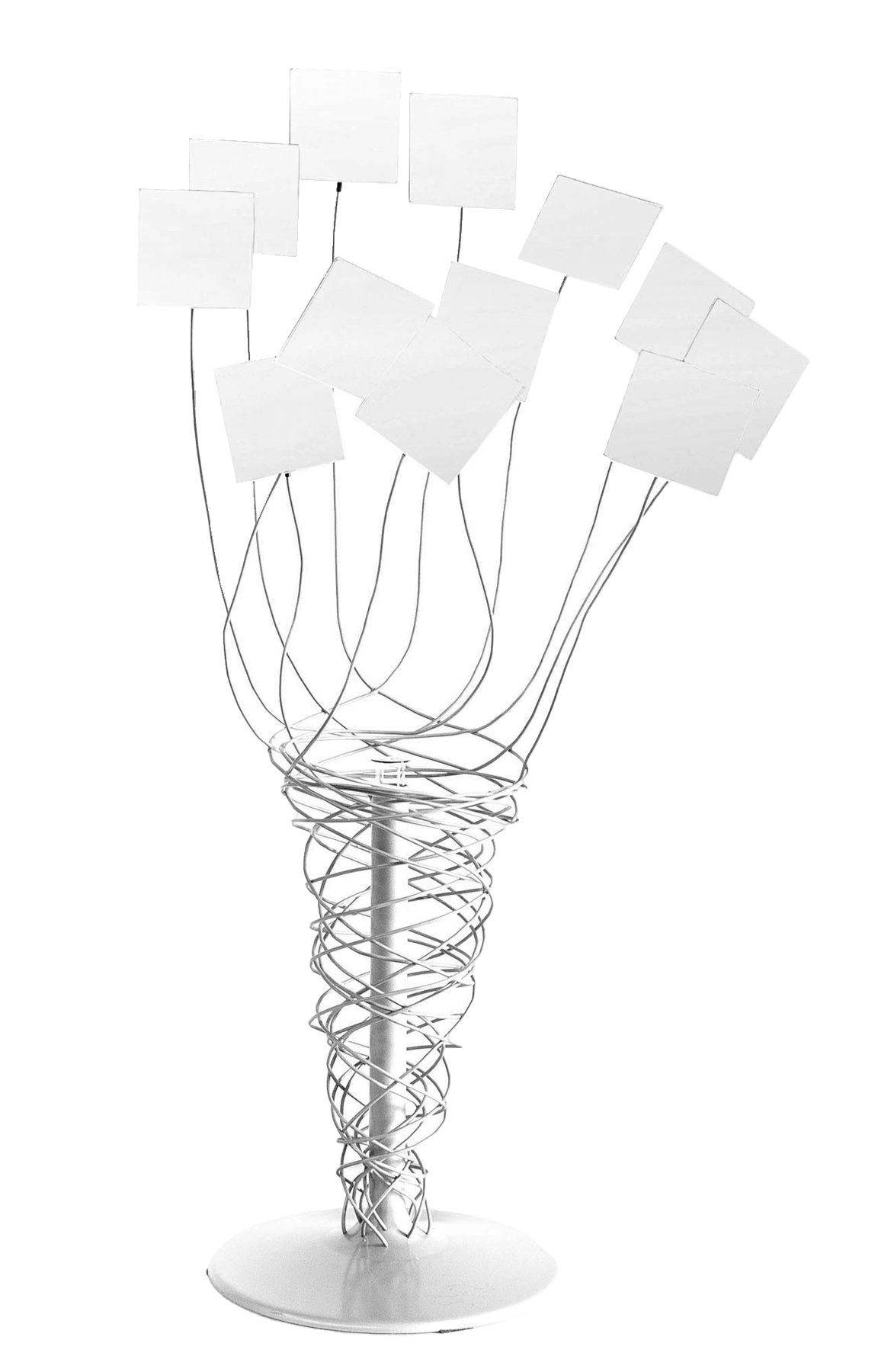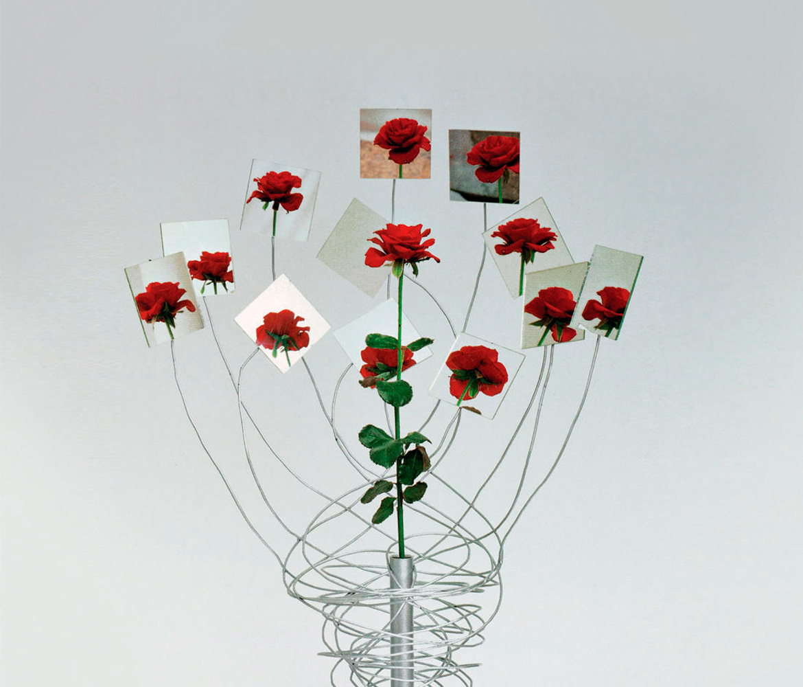 Vaso per singolo fiore composto da dodici rami in metallo sabbiato che avvolgono il vaso. I rami terminano con piccoli specchi orientabili, creando l’illusione di un intero mazzo di fiori.