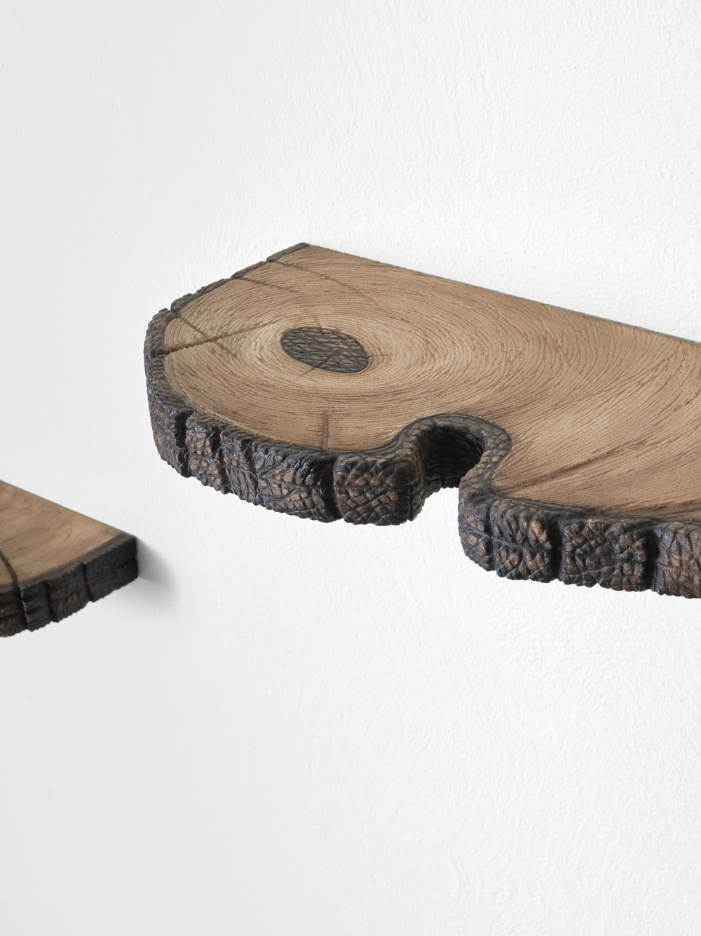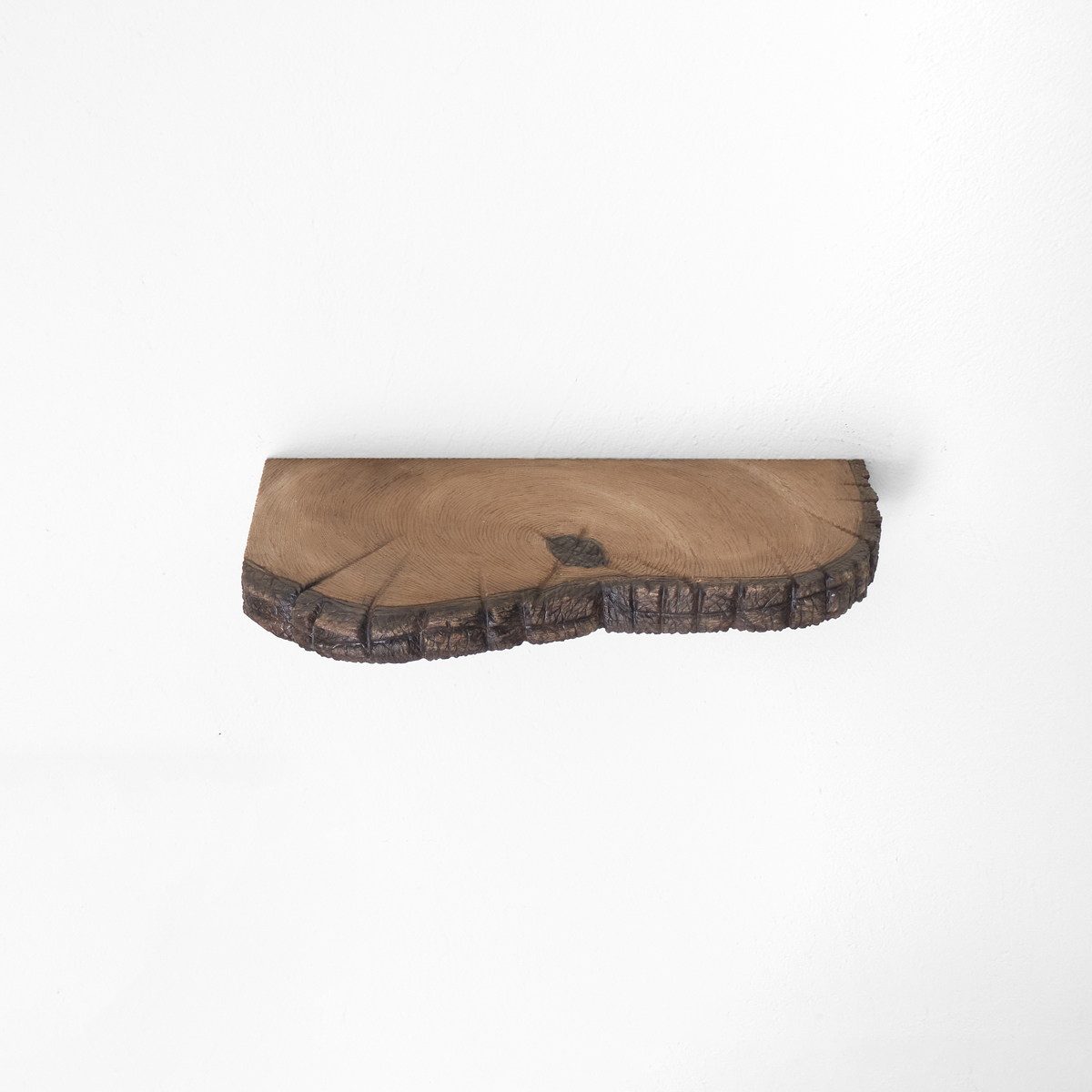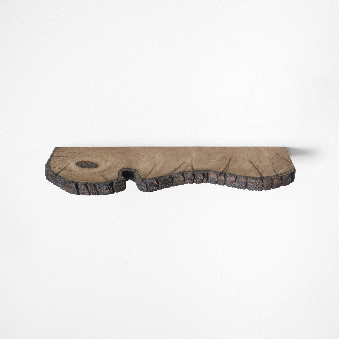 Mensola realizzata in marmo bianco di Carrara e dotata di sistema di fissaggio a parete a scomparsa. La lastra viene lavorata in modo da evocare la sezione di un tronco d’albero, con forma irregolare e naturale. La superficie lavorata mette in evidenza gli anelli di crescita, mentre i bordi, più scuri, richiamano la corteccia dell'albero.