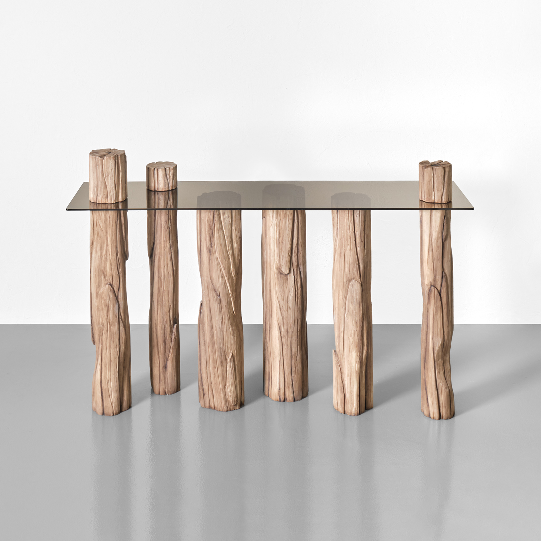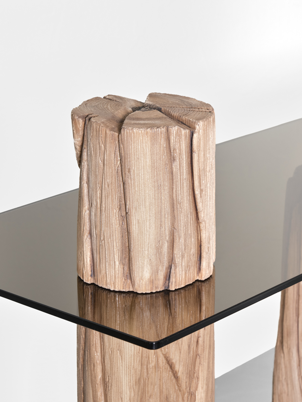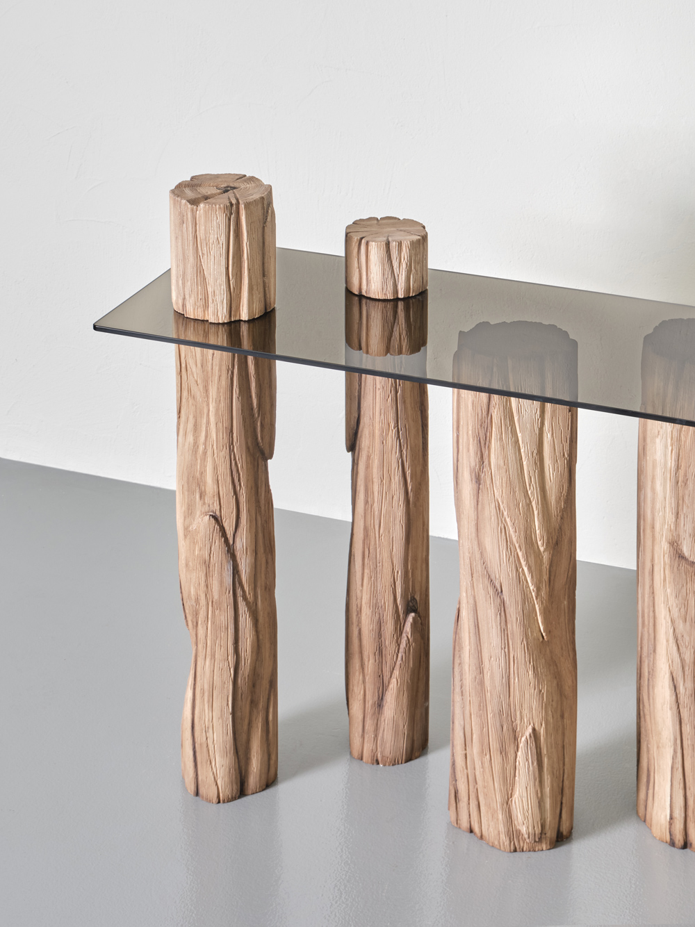 Consolle composta da sei elementi di forma cilindrica in marmo bianco di Carrara di altezze e diametri diversi, sagomati e dipinti in modo da evocare tronchi d'albero. Questi elementi in parte perforano un piano in vetro bronzato, che sembra quasi essere sospeso sulla serie di cilindri verticali. Le forme irregolari, le venature a vista e le imperfezioni trasformano ogni supporto in un pezzo unico, enfatizzandone il richiamo al mondo naturale.