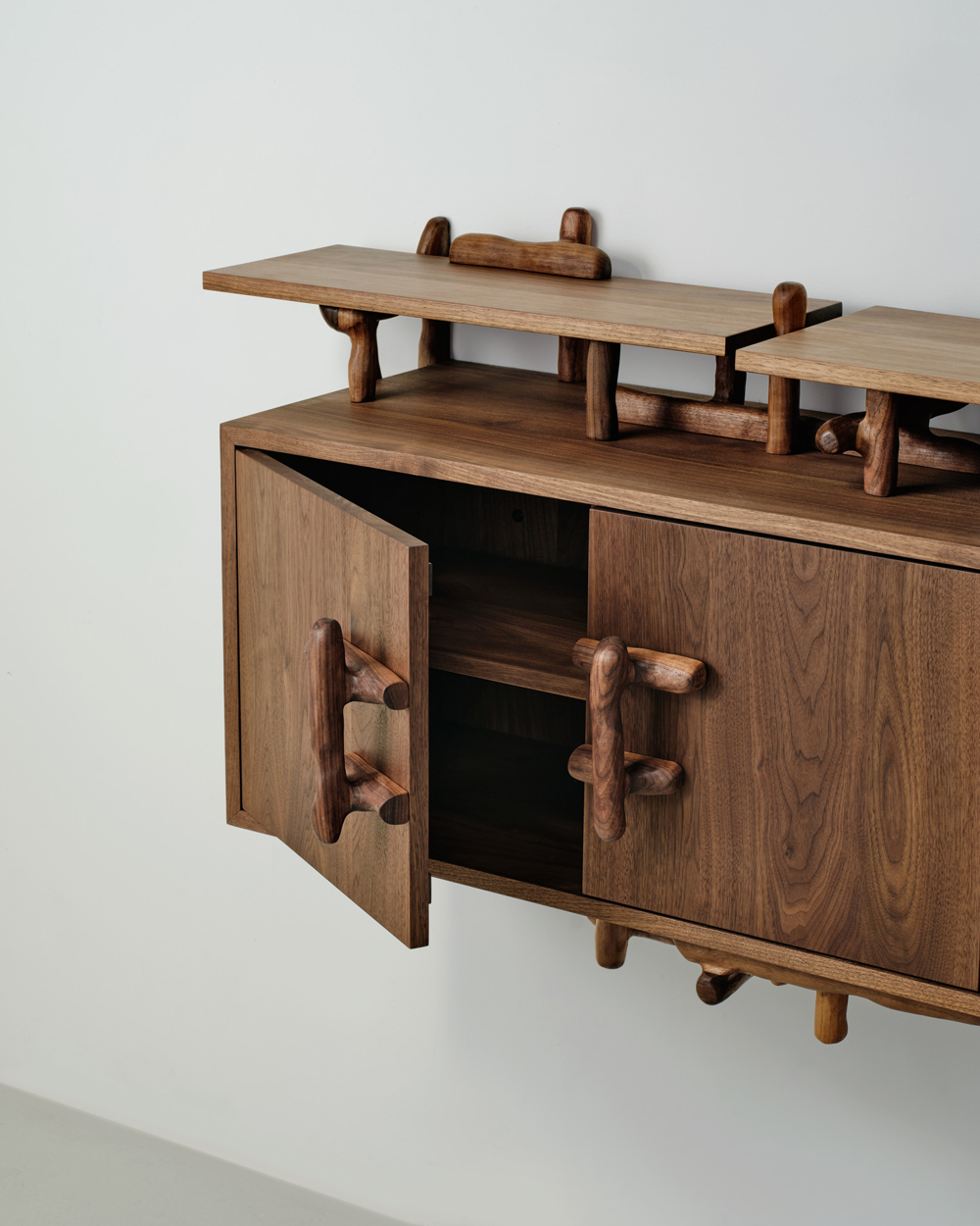 La credenza da parete Hedera è una fusione di forme pulite ed organiche. Sembra una scatola di legno posizionata in una foresta e gradualmente ricoperta da una rigogliosa pianta rampicante. Germogli e radici flessibili sembrano aver trovato spazio in ogni fessura per crescere, fondendosi infine in un nuovo insieme armonioso. Finitura satinata ad olio.