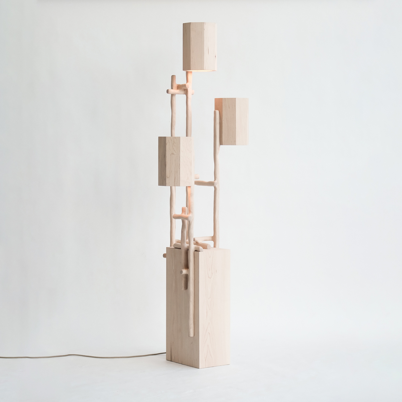 La lampada da terra Hedera è realizzata con un blocco di legno d'acero ricoperto da vari germogli che sembrano crescere verso la luce e fiorire, mentre i paralumi, con un po' di immaginazione, ricordano la corolla di un fiore. Una caratteristica particolare di questo design è che i cavi elettrici sono completamente nascosti all'interno della struttura in legno, lasciando che il legno d'acero sia il protagonista. Luce dimmerabile.