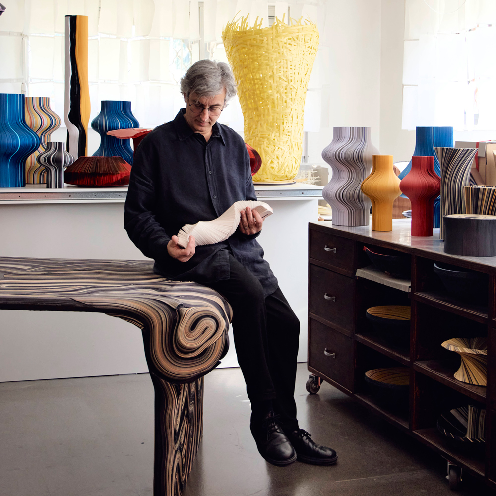 His products use handmade paper, selected by colour and weight. His research enters art galleries with a series of collective and solo exhibitions, from sculpture to design, to installations and sets for important fashion brands, fairs and galleries. He defines himself as a “sculptographer” in continuous dialogue with materials, places and space.