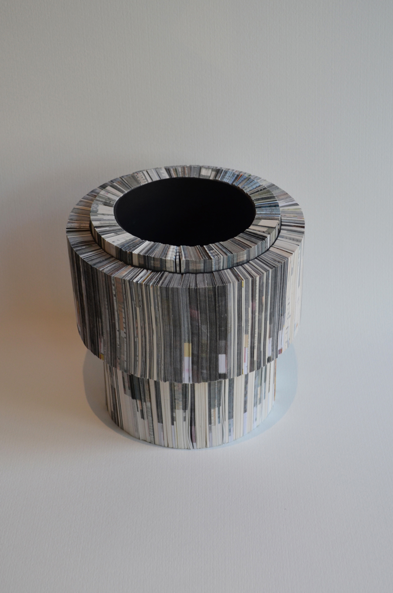 Sculptural vase from Paperwords collection made of strips of cardboard used for proofreading typographical printing sheet. Paper recovered and reused. Cut profiles reveal signs, inks, word traces and images.