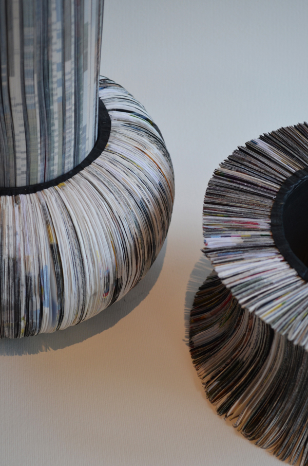 Sculptural vase from Paperwords collection made of strips of cardboard used for proofreading typographical printing sheet. Paper recovered and reused. Cut profiles reveal signs, inks, word traces and images.