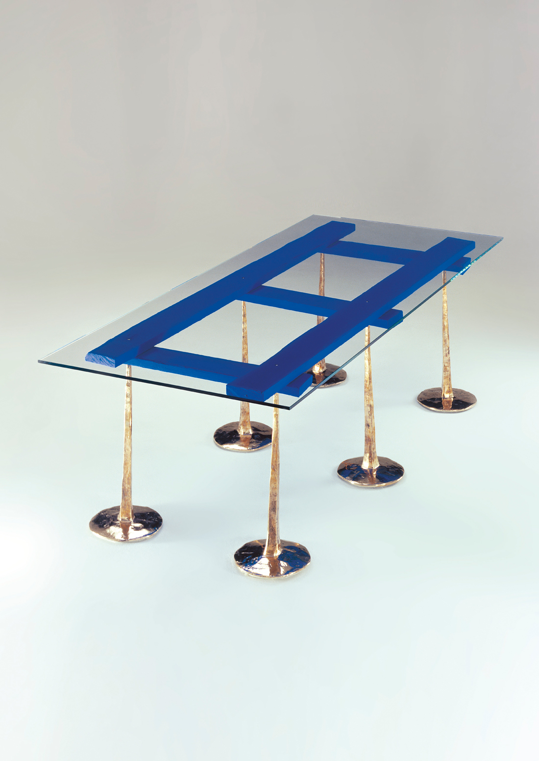 Dining table with a crystal top pinned on a lacquered wooden frame (available in various colours) into which the "nails" (legs), made of cast aluminum or bronze, are fixed. Available legs finishes: nickel-plated or gold-plated cast aluminum, natural brass, or natural cast bronze.
