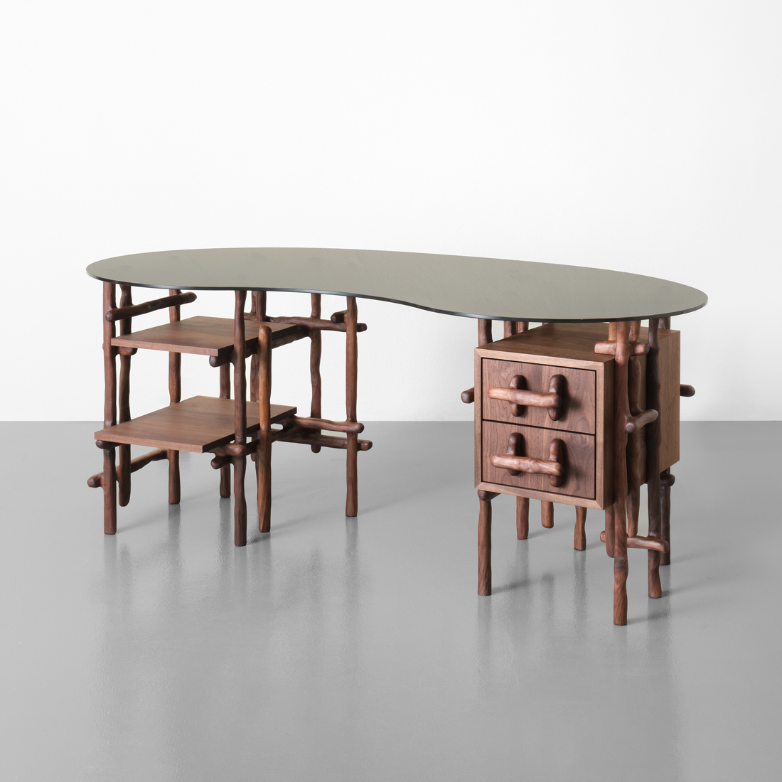 The Hedera Desk is not only a fusion of clean and organic lines, but also of materials. It looks as though young shoots have grown against the glass, eventually forming a supporting structure. The brown, matte glass creates a contrast with its smooth, reflective surface, yet also feels like a natural continuation of the dark walnut wood into another material due to its foggy effect.